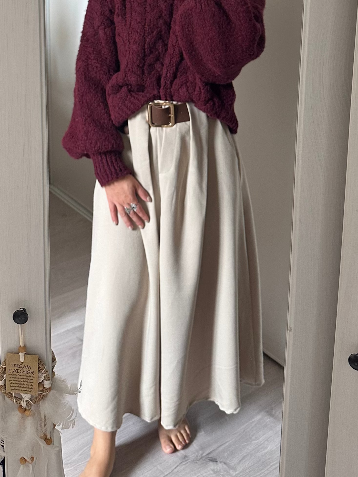 ♥︎ Jupe longue beige avec ceinture, plis à l'avant, élastique à l'arrière de la taille, poches sur les côtés.